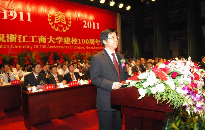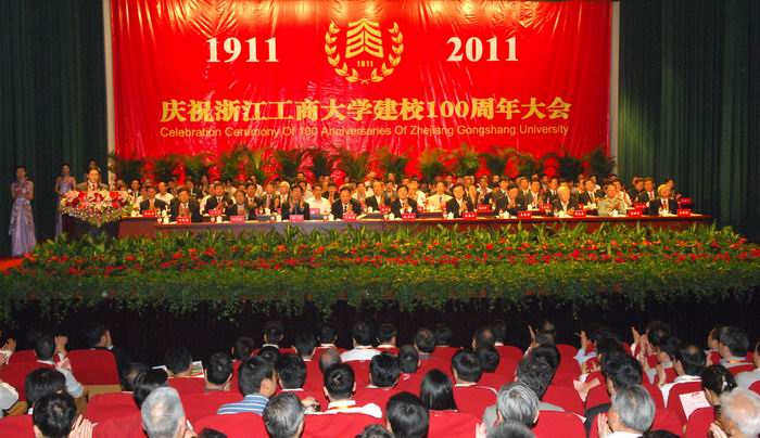 浙江工商大学校园内彩旗招展,庆典大会现场鲜花绽放、喜气洋洋,一派节日气氛。主席台背景正中的浙江工商大学校标分外耀眼,1911和2011的字样分列两侧,标示着浙江工商大学已经走过百年风雨历程。会场二层看台外围悬挂着大幅红色标语,上面写着:“创新强校,特色名校,加快转型,跻身百强 努力建设有特色、高水平、综合性的教学研究型大学!”