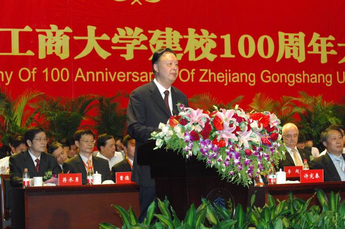 省委常委、宣传部长茅临生在大会上发表讲话。他代表省委省政府对我校百年校庆表示祝贺。他充分肯定了与辛亥革命同龄的浙江工商大学100年来始终秉承“诚毅勤朴”校训,与国家命运、民主进步紧密相连,艰苦奋斗、励精图治,取得了令人瞩目的成就,为国家、社会培养了一大批优秀人才,为浙江经济社会发展做出了重要贡献。