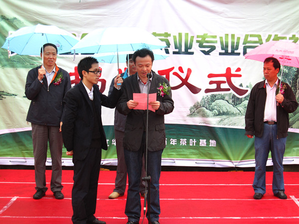 2011年9月30日我校与天台县白鹤镇结对帮扶项目“金万年茶叶专业合作社” 揭牌仪式在天台县白鹤镇万年山村举行,天台县人大常委会副主任施逢沪、天台县人民政府 副县长蔡文新及天台县相关部门领导、白鹤镇党政领导出席开工仪式。我校“低收入农户奔小康工程”结对帮扶领导小组副组长、校工会主席姚晓明代表学校出席揭牌仪式并致词。