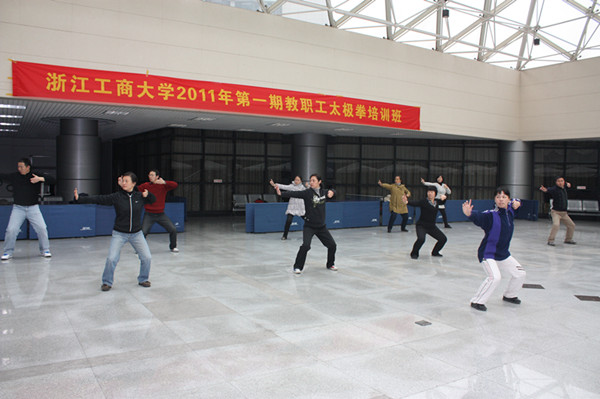 在学校领导、校体委的大力支持和体工部的配合下,浙江工商大学工会2011校内首期教职工太极拳培训班于111如期在我校下沙校区和教工路校区同时开班,来自校内各机关及学院分工会的近70名学员参加了首期培训班的学习。首期太极拳培训班的开办在广大教职工中产生了良好的影响和示范作用,太极相伴,精享人生,在校内太极拳爱好者中已经形成共识。广大学员对培训老师严谨的教学、负责的态度和专业的指导赞不绝口,纷纷表示收获巨大,今后将继续坚持和强化太极拳的学习和锻炼,并在太极拳运动中得到健康,汲取智慧,以健康的体魄工作和生活,在各自岗位上为学校的发展贡献力量。