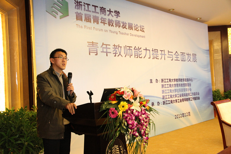 论坛主题报告阶段,上海海事大学胡志华博士,省教育工会青工委主任、浙江大学魏江教授,省首届十佳青年教师、浙江工业大学艾宁博士和我校首届十佳青年教师郭宝才副教授分别以“教学、科研与社会服务的协调发展”、“青年教师成长战略”、“青年教师成长体会”、“青年教师的教与学”等为主题,向与会代表分享自己的成功经验和体会,鼓励广大青年教师勇于面临发展过程中的各种压力和困难,要有不断进步的动力,真心热爱教师这一光辉的职业,协调教学与科研平衡,享受与学生一起成长的快乐。