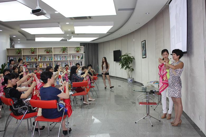 商大80多位爱美的女性兴趣盎然地聆听了丝巾专家的现场演绎,在艾老师的精心教授下,老师们纷纷用上丝巾为自己装扮,接下来的会场变成了魅力四射的T台秀,原来女教师们严谨教学之外更有优雅时尚的一面,瞧,很多老师自告奋勇当起模特,有的把丝巾系在颈间成了别致的蝴蝶飞,有的把丝巾系在身上成了美丽的连衣裙,有的老师摆起POS还挺有范儿的,活动中笑声赞叹声不断。