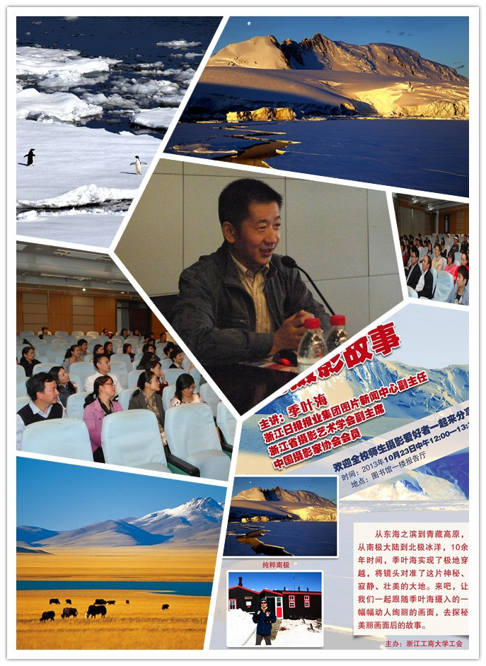 季先生把他10余年时间从东海之滨到青藏高原,从南极大陆到北极冰洋,将世界三极神秘、寂静、壮美的景色用镜头语言简要给大家作了深入展示,诠释了点、面、线在摄影作品创作中的运用。一幅幅绚丽多彩的画面、一张张动人美的瞬间和他富有情感的表述,不时引来聆听讲座的摄影爱好者感叹和共鸣。