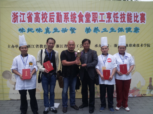 为进一步组织广大教职工在“十二五”期间开展社会主义劳动竞赛和“建功立业”活动,提高全省高校后勤系统食堂职工服务教育发展、服务教职员工、服务全体学生的能力和水平,由省教育厅、省教育工会主办,浙江商业职业技术学院协办的全省高校后勤系统食堂职工烹饪技能比赛,于2014年11月1日在杭州成功举办。省教育工会主席李逸凡、副主席陈勇等亲临比赛现场指导比赛,并为获奖选手颁发证书及奖杯。