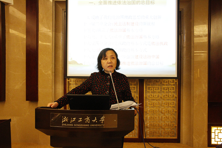 李逸凡在会上作了“十八届四中全会专题辅导报告”,她从全面推进依法治国的总目标、全面推进依法治国的重大任务、全面深化法治浙江建设、努力提高工会工作法制化、制度化水平等四个方面,深入浅出地对党的十八届四中全会决议做了解读,并要求各高校工会干部要以设立国家宪法日为契机,深入开展法制宣传教育,大力弘扬宪法精神,切实增强法律意识,并在实际工作中灵活运用。
