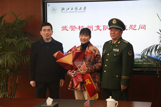 3月8日上午,武警杭州支队支队长上官恒辉一行4人来我校走访慰问支队现役军官家属——我校法学院教师顾赵丽。学校党委副书记钱天国,妇联主席袁伟菊,学工部部长何波,法学院副院长苏新建,法学院副书记牛翔等同志参加了慰问活动。