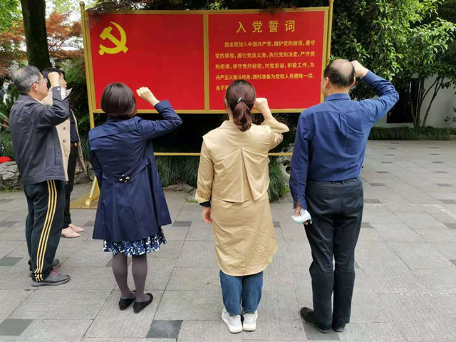 在宣誓厅,全体党员举起右拳,在鲜艳的党旗前进行了入党宣誓,表达不忘初心、牢记使命的坚定决心。