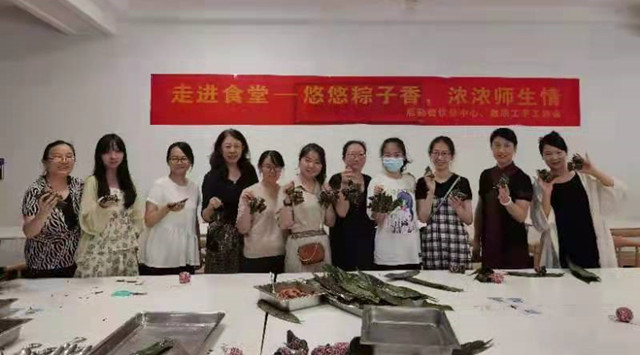 彩线轻缠红玉臂,小符斜挂绿云鬟。五月初五,是我们中华民族的传统节日—端午节,为迎接即将到来的节日,感受端午气息,商大手工协会与后勤餐饮分中心联合在下沙、教工路两校区组织了“迎端午,共包粽”的活动,共有60余人参加。 活动现场糯米、粽叶、腊肉、捆绳、剪刀整齐摆放上桌,食堂师傅给大家做了详细示范,大家齐刷刷站成两排,个个跃跃欲试,技术娴熟的老师不到一分钟就可以包好一个,现学的人相对手拙,显得有些手忙脚乱,屡屡出现漏米、粽叶破损情况,但在经验老道人的指导下,也有模有样的完成了,大家欢声笑语,其乐融融,不一会儿,正方形、三角形、长条形••••••各式各样的粽子都陆续诞生,经过1个小时的努力,40斤大米变成了一个个满怀情义的粽子。大家手捧自己的劳动成果,纷纷留下美照,她们非常享受包粽子的过程,感觉包的不是粽子,而是快乐。