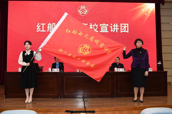 大会宣布红船女儿高校宣讲团正式成立并授旗,124名优秀红船女儿成为宣讲团首批成员。会上,来自浙江工商大学的章竞帆作为红船女儿高校宣讲团的成员代表发言。大会还为各高校宣讲团代表颁发了证书。