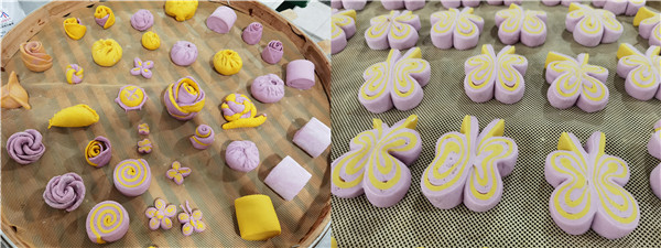 本次活动还为各位老师准备了三色面团,除了白面之外,还有紫薯面团和玉米面团。后勤师傅现场演示如何擀面、制作,在师傅的巧手下,各式花样的馒头立于案板之上,有的像蝴蝶,有的像玫瑰。各位老师也纷纷变身面点大师,将小小面团捏出不同造型,整齐地码放在蒸笼上,等待自己的面点大作惊喜出炉。