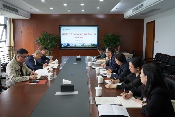 4月23日上午,钱塘区教育局党委书记、局长吴波携基础教育科科长田建军、督导评估中心主任汪海来校交流。校党委副书记方向明出席交流会,校工会主席袁伟菊、马克思主义学院执行院长李梦云、后勤服务中心主任孟威、浙商博物馆副馆长钭卓珍等参加交流。