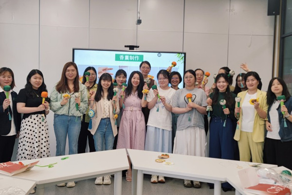 在制作香包的现场,五彩的丝线在大家手中灵动穿梭,一个个寓意美好的香囊和养生锤逐渐完美呈现。大家边做边谈,相互分享着制作香包的技巧与心得,欢声笑语在整个活动场地久久回荡。此次制作的香包不仅外形精美,其内部填充的香料更具有预防疾病、提升免疫力等功效。