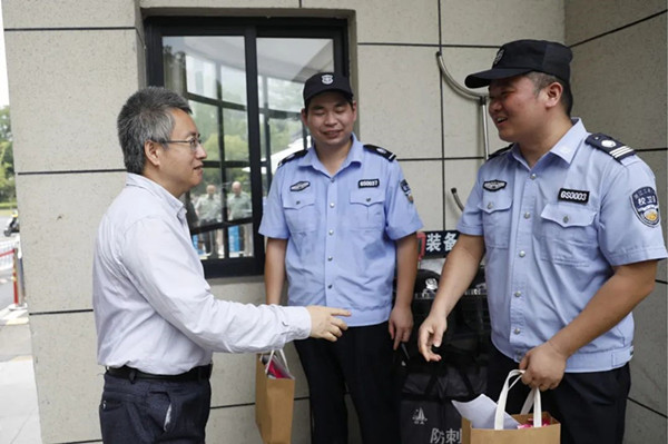 在钱江湾生活区二号门门岗处,王永贵与安保人员进行了亲切交流,对他们的专业精神和辛勤付出表示赞赏,并亲自送上了慰问品。他特别强调了门岗管控的重要性,并要求安保人员在入校检查上要更加严格,同时也要注意自身的防暑降温和安全防范。