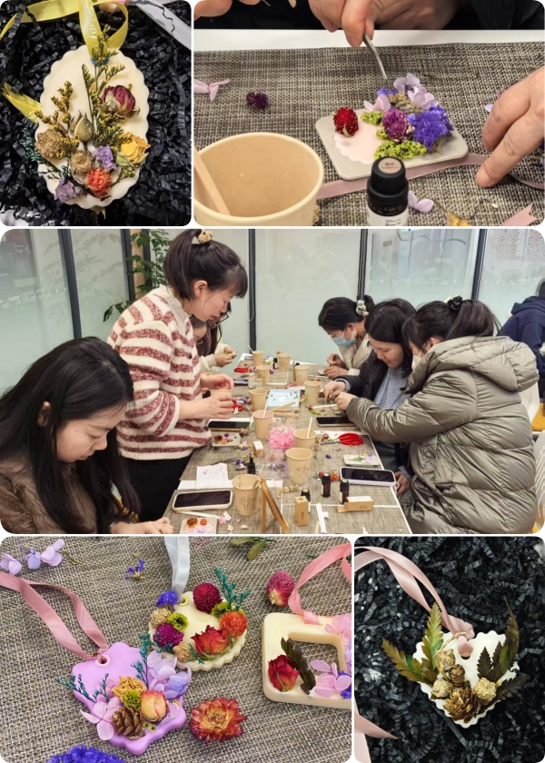 在下沙校区的活动现场,来自馥蕴生活手作工坊的赵丽君老师早早为各位女神摆放好所需的手作材料。本次活动为各位老师准备了绣球花,松果,草莓果,柠檬片,敖菊,情人草,勿忘我等干花、多种类型的花香和木质香精油,各色染剂以及各种形状的模具。各位老师在赵老师的指导下,先挑选各色干花,搭配模具形状,摆出自己喜欢的造型。再将适量天然热蜡倒进纸杯中,滴入自己喜欢的颜色和精油,搅拌均匀,调配蜡片颜色和香味。将调配好的热蜡倒入模具中,静待热蜡成膜。最后用镊子将干花按照先前设计的造型,逐一快速插入蜡片中,静待蜡片凝固。凝固脱模后,加上金属扣,系上各色丝带,一个兼具美观和熏香功用的手作香薰蜡片就完成啦!