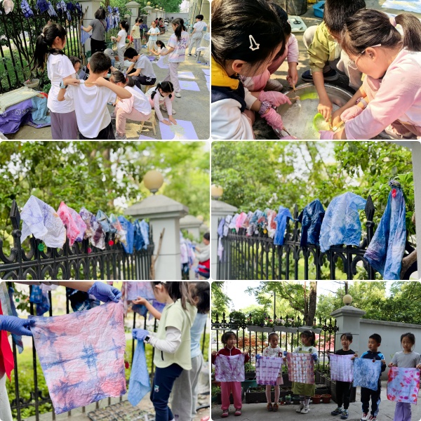 “瞧,这样折布就会像小扇子一样!”“快把皮筋捆紧些,这样才能染出漂亮的星星图案!”在杨辉老师的耐心指导下,孩子们用皮筋将布料捆扎出或紧或松的褶皱,然后手持竹筷,轻轻搅动染液。他们的小手虽然稚嫩,但动作却格外认真。完成染色后,孩子们争先恐后地将自己的作品晾晒起来,一件件花型多样的扎染作品在微风中轻轻摇曳,宛如一幅幅绚丽多彩的画卷。