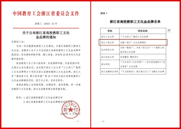 2024 年,在各二级工会积极参与下,校工会立项了 16 项教职工“一会一品”文化品牌建设项目。其中,后勤服务中心“绿叶”文化品牌荣获2024年度浙江省高校教职工文化金品牌(全省仅6项),这是继我校图书馆“悦读”文化品牌获评首届浙江省高校教职工文化金品牌后再次获此殊荣,充分展现了我校教职工文化品牌建设成效。