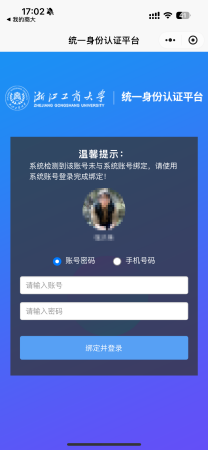 启动“微信运动”后,进入学校统一身份认证登陆界面,进行绑定并登录。