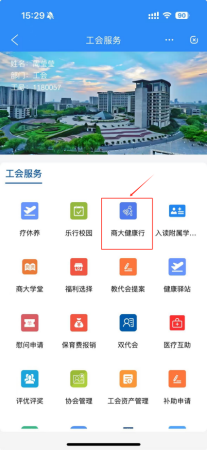 我的商大APP→首页→常用服务→工会服务→商大健康行,自动跳转到小程序“商大健康行”,或者在微信直接搜索小程序“商大健康行”点击进入。
