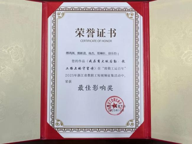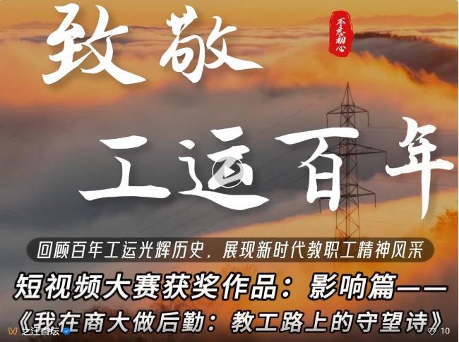 近日喜讯传来,由校工会选送、后勤服务中心工会摄制的作品《我在商大做后勤:教工路上的守望诗》,凭借其深刻的主题表达与生动的艺术呈现,荣获2025年浙江省教职工短视频“最佳影响力”奖。该作品以教工路后勤人的日常坚守为叙事主线,通过诗化镜头语言生动诠释了新时代我校教职工的劳动之美、奋斗之美与生活之美,成为工运百年历史长卷中一抹温暖而隽永的注脚。