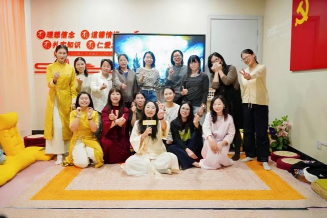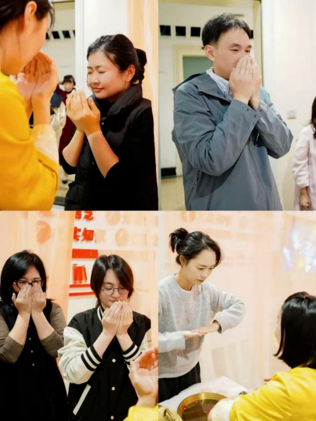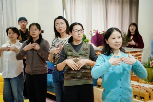 步入精心布置的沙龙现场,净手闻香的入幕仪式率先抚慰了身心。在氤氲着植物清香的水盆中净手,涤去尘埃与疲惫;再俯身轻嗅特地准备的精油,植物能量通过嗅觉直抵心灵。这一系列温和的仪式,配合着轻柔的音乐与温暖的灯光,瞬间构筑了一个安全而放松的结界,引导大家从日常的忙碌中抽离,全然投入接下来的身心探索。随后,在柔和的灯光下,全体老师在活动主持人的带领下,共同学习并演绎了手语舞《让爱传出去》。流淌的旋律和充满善意的手势。当“爱是看不见的语言,爱是摸不到的感觉”化作指尖的温柔流转,一种无声的默契与暖流在现场每个人之间传递、共鸣。为整场活动奠定了温暖而纯粹的基调。