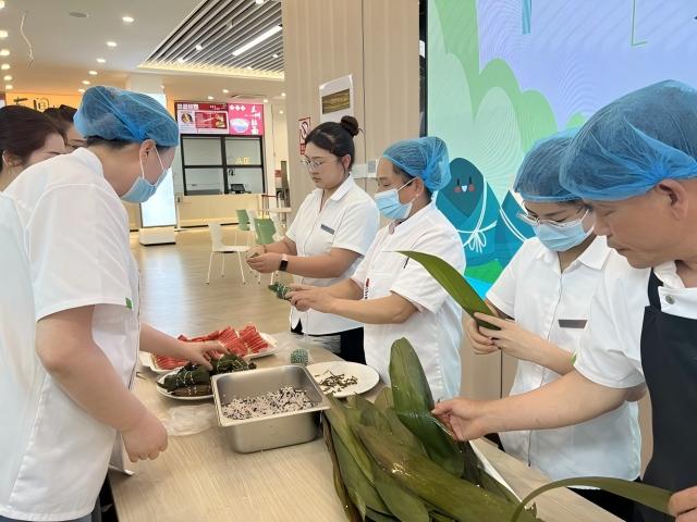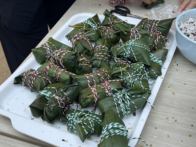 随后,包粽子环节正式开始。现场粽叶翻飞、麻绳穿梭,大家各显身手,创意十足。三角粽棱角分明、四角粽扎实饱满、长粽细长飘逸,还有各种造型独特的创意粽子层出不穷。大家一边包粽子,一边交流心得,欢声笑语不断,浓浓的节日氛围弥漫在餐厅的每一个角落。经过近一个小时的努力,一个个饱含着大家心血的粽子摆满了桌面,虽然这些粽子大小不一、形状不同,但每一个都承载着参与者对传统文化的热爱和对节日的美好祝福。