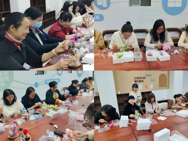 本次活动为员工搭建了一处忙碌工作中的“心灵驿站”,让大家在动手创作中放松身心、感受手作温度。活动现场安排细致周全,备有品类丰富的永生花素材——从饱满盛放的玫瑰、清雅脱俗的铃兰,到点缀其间的细碎满天星与尤加利叶,色彩涵盖柔粉、雅白、暖黄、淡紫等多种雅致色调,充分满足不同创作需求。在刘老师的分步讲解与悉心指导下,大家快速掌握了永生花修剪塑形、花枝固定、色彩搭配等核心技巧。随后,大家纷纷投入创作,或俯身细致挑选花材,或轻声交流布局思路,或专注调整花束角度,将一朵朵形态各异、色泽温润的永生花巧妙搭配在精致容器中,亲手打造出一件件独具匠心、的艺术摆件。整个“银杏叶”工匠室内,既弥漫着永生花的淡雅香气,又充盈着同事间互助交流的欢声笑语,温馨热烈的氛围感染着每一个人。
