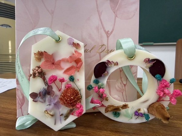 3月9日中午,协会在教工路校区举办手作香薰蜡牌活动。手作老师为商大女神们准备了绣球花、松果、草莓果、情人草、勿忘我等干花,以及多种香型的香氛和不同形状的模具。在手作老师的指导下,老师们将调配好的各色热蜡倒入模具,待其成膜后,用镊子将干花快速插入蜡牌中,静待蜡牌凝固。凝固脱模后,再搭配金属扣、系上各色丝带,一个兼具美观与熏香功能的手作香薰蜡牌便完成了。