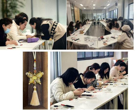 3月11日中午,协会在下沙校区举办宋锦挂坠DIY活动。宋锦是国家级非物质文化遗产,素有“锦绣之冠”的美誉,其织工精细、格调高雅,承载着古代织女的匠心,镌刻着东方女性的灵巧。活动现场为大家准备了平安锁、蝴蝶和福袋三个寓意吉祥的造型,在手作老师的指导下,老师们按照不同的造型裁剪宋锦,用胶水将宋锦固定在金属外框里,再搭配上不同颜色的挂绳和吊穗,一枚蕴含非遗韵味与诚挚祝福的宋锦挂坠便悄然成型。