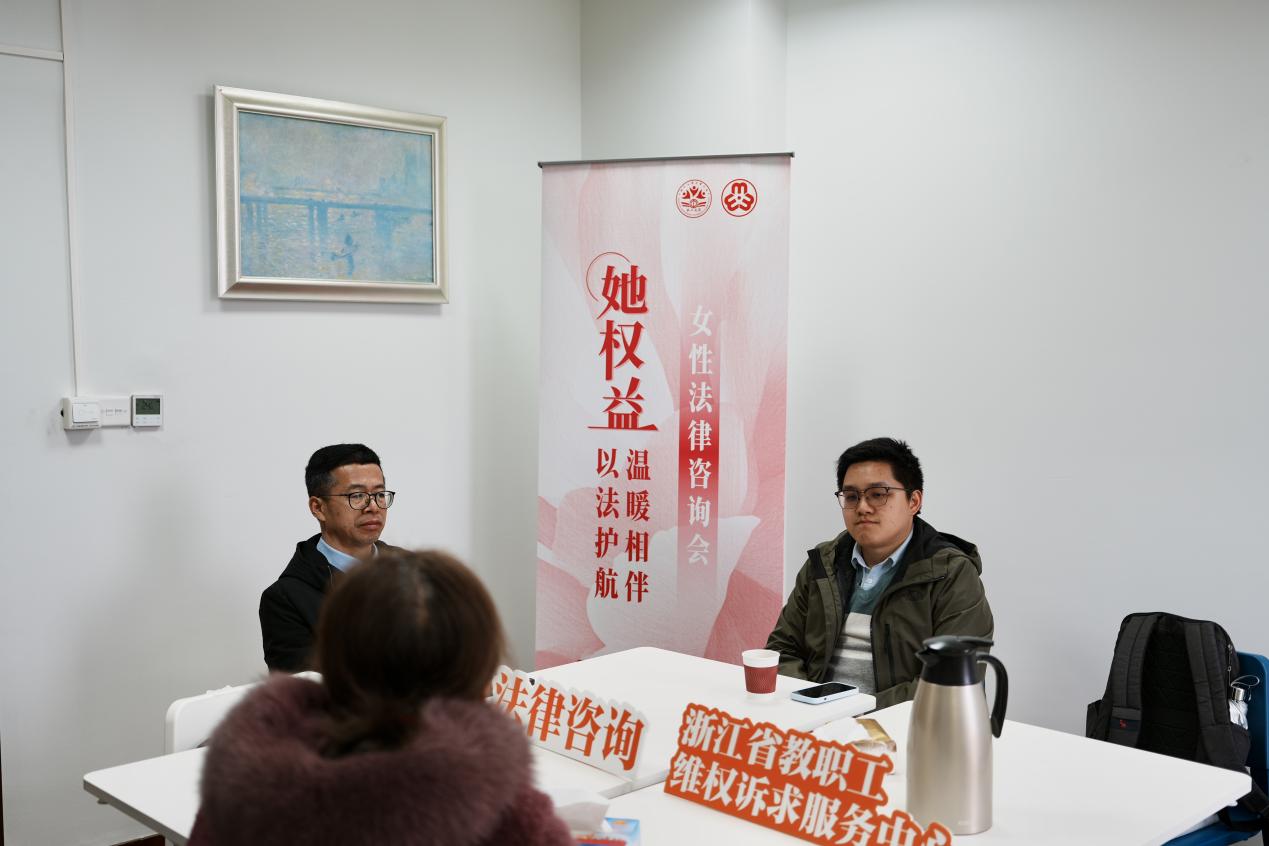 法律咨询专区,学校联合浙商大法学院、浙江中格律师事务所、浙江省教职工维权诉求中心,邀请季长龙、陈卓超两位专业律师现场值守,为女性教职工提供一对一公益法律咨询服务,围绕权益保障、纠纷化解等问题细致答疑,以法治力量守护“她权益”,筑牢女性权益防护线。