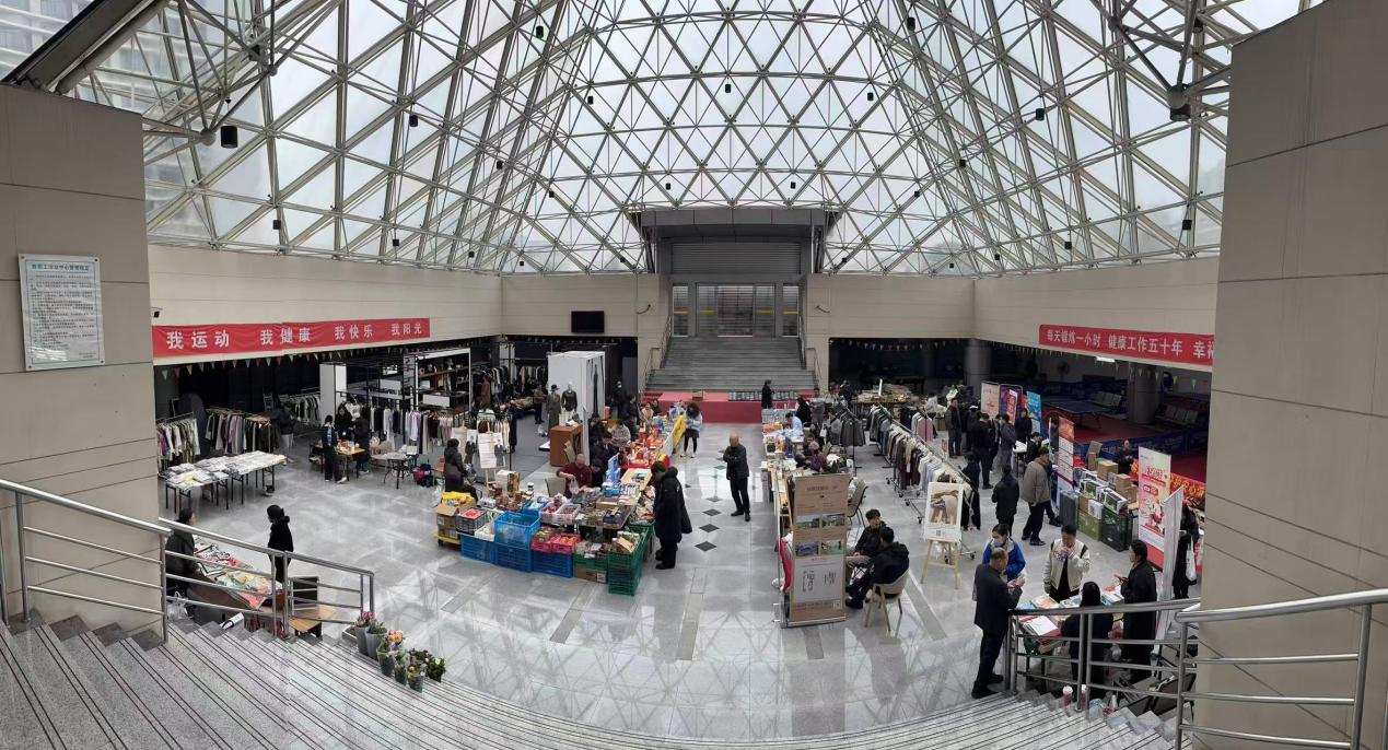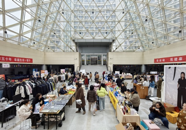 惠师集市专区,各类优质好物琳琅满目,慕江南女装、达利丝绸、濮院羊绒、雅戈尔衬衣,尽显生活质感,各地特色农产品满载烟火气息,金融、地产专属优惠诚意满满,今年的校内展销区更是让人眼前一亮:英贤慈善学院精品美妆义卖、大学生创业手工饰品品牌“南山手作”、浙商大出版社好书特惠展销。让老师们流连忘返、赞不绝口。集市以实惠价格、优质品类为教职工带来贴心福利,现场人气高涨、热闹非凡。