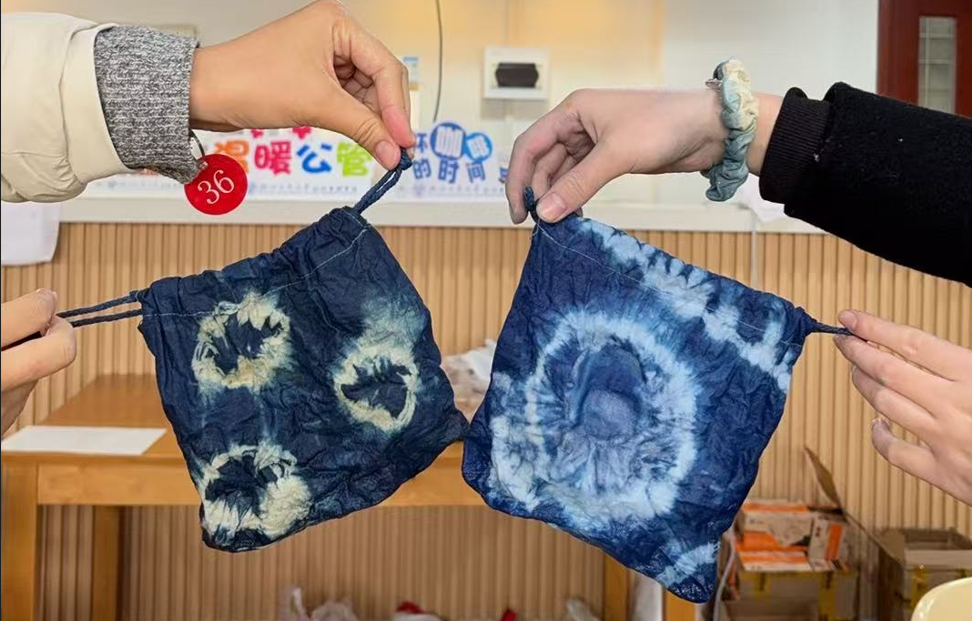 几位年轻教师则挑战“型染+扎染”复合技法。她们先用防染剂在帆布包上勾勒出梅花等图案,再通过扎染填补背景色。最终成型的包包既有非遗的古朴韵味,又融入了现代设计元素,成为活动中的“人气单品”。