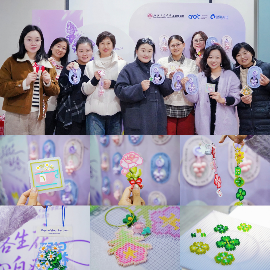 活动尾声,老师们手持自己的拼豆作品合影留念。一朵朵色彩斑斓的花朵,在春日午后绽放,也定格了这个属于“她”的美好时刻。“豆落生花,心自疗愈。”这不仅是一场温馨的手作体验,更是一次温柔的心灵休憩与滋养。一直以来,校工会、妇联始终将关爱教职工身心健康作为工作重点,后续还将继续携手校教职工“一会一品”文化品牌重点建设项目——艺术设计学院“艺造心生”艺术实践咖啡沙龙,以美育润心,以艺术疗愈,为师生带来更多有温度、有深度的活动体验。